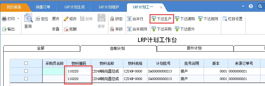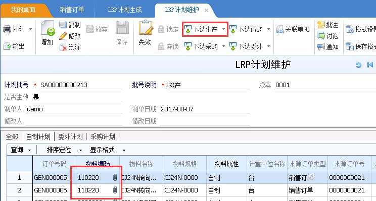 2.在LRP計劃作業(yè) - LRP計劃生產(chǎn)中查詢相應(yīng)銷售訂單,生成LRP生產(chǎn)計劃,在LRP計劃維護中聯(lián)查到相應(yīng)單據(jù)或者在LRP計劃工作臺查詢到相應(yīng)計劃,選擇需要下達生產(chǎn)的成品