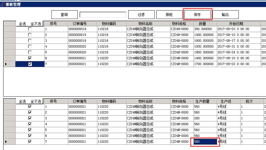 6.然后點擊相中需要排產(chǎn)的訂單,點擊進行排班按鈕,自動根據(jù)條件計算出的排班信息在下方顯示,可以手動修改班產(chǎn)量、生產(chǎn)日期