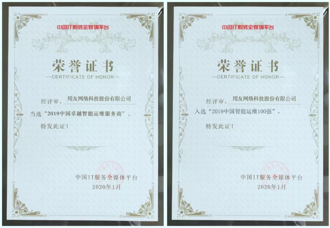 1月9日,第十二屆電子信息產(chǎn)業(yè)標準推動會暨中國信息技術(shù)服務標準年會(2020)在京成功召開。旨在展示電子信息產(chǎn)業(yè)標準和信息技術(shù)服務業(yè)發(fā)展成果。用友網(wǎng)絡科技股份有限公司憑借服務企業(yè)數(shù)字化轉(zhuǎn)型的突出表現(xiàn)和IT運維服務智能化的創(chuàng)新發(fā)展,入選2019-2020中國信息技術(shù)服務智能運維100強榜單,并榮獲“2019中國IT服務領(lǐng)軍企業(yè)”、“2019中國智能運維服務商“兩項大獎。